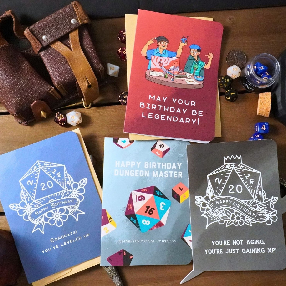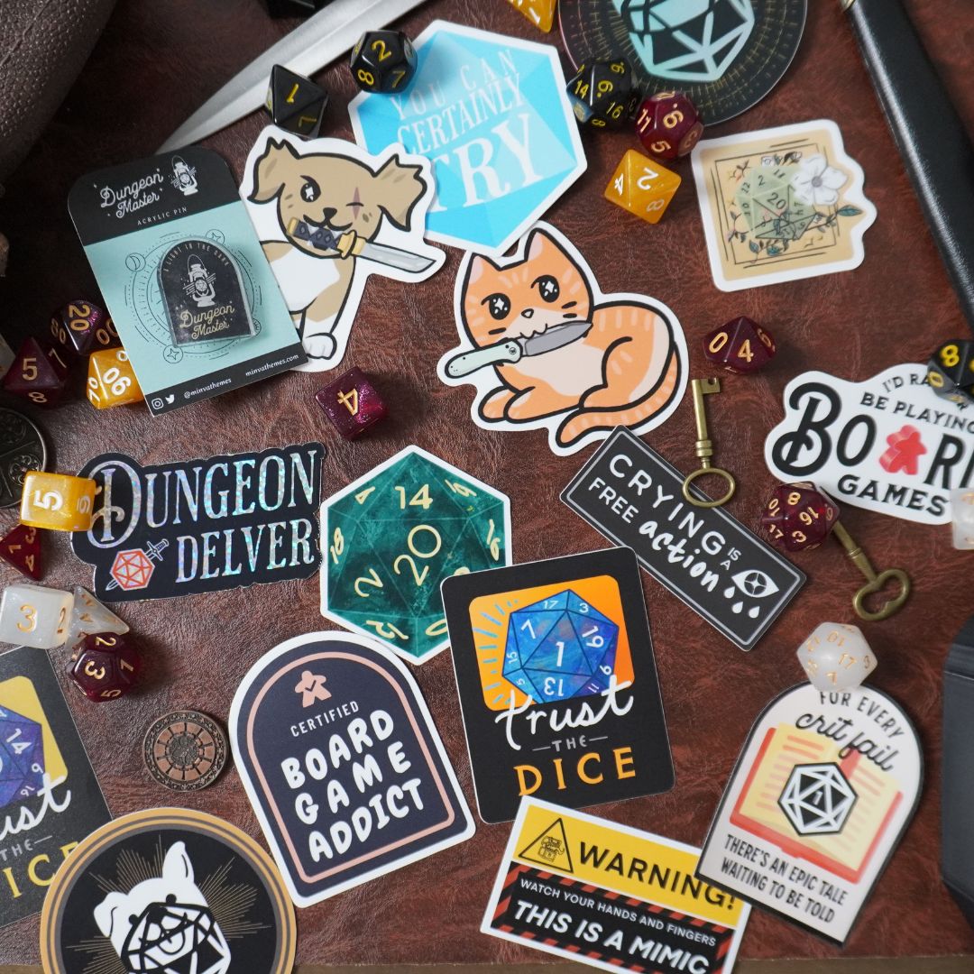 • A selection of unique items like pins, stickers, greeting cards, weapon cards, keychains, journals, and dice trays—designed in-house by our artists